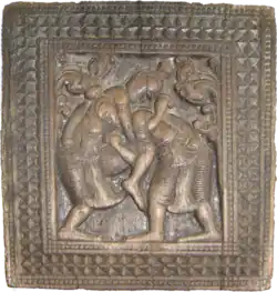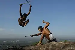 Angampora is a Sinhalese martial art that combines combat techniques, self-defense, sport, exercise, and meditation.[1][2] A key component of angampora is the namesake angam, which incorporates hand-to-hand fighting, and illangam, involving the use of indigenous weapons such as the ethunu kaduwa, staves, knives and swords.[3][4] Another component known as maya angam, which uses spells and incantations for combat, is also said to have existed.[5] Angampora's distinct feature lies in the use of pressure point attacks to inflict pain or permanently paralyze the opponent. Fighters usually make use of both striking and grappling techniques, and fight until the opponent is caught in a submission lock that they cannot escape. Usage of weapons is discretionary. Perimeters of fighting are defined in advance, and in some of the cases is a pit.[5][6]