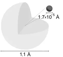 ![]() The width of a hydrogen atom is about 1.1 angstroms; the width of a proton (in black) is 1.7×10−5 angstroms. | |