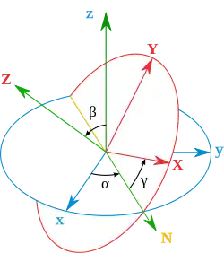 - The line of nodes of the moving frame with respect to the reference frame (nutation axis)