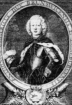 In 1733, Elisabeth converted to the Russian Orthodox Church and was given the name Anna Leopoldovna,[4] which was a compliment to her aunt, Empress Anna, and also to her father, Karl Leopold, Duke of Mecklenburg-Schwerin. Her conversion to the Orthodox faith made her acceptable as heiress to the throne, but she was never actually declared heiress by her aunt. In 1739, Anna Leopoldovna, as she was now known, was given in marriage to Anthony Ulrich (1714–1774), the second son of Ferdinand Albert, Duke of Brunswick-Wolfenbüttel.[2] Ulrich had lived in Russia since 1733 so that he and his bride could get to know each other better. He was able to do so because he was a younger son, and it was improbable that he would be called upon to shoulder the responsibility of ruling his father's principality. Both circumstances clearly indicate that Empress Anna intended her niece to inherit her throne, and was laying the ground for that by selecting a husband of suitable birth and situation and by observing him at close quarters for several years before the marriage was celebrated.