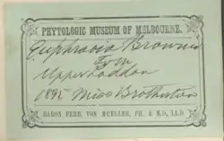 The specimens collected by Miss Brotherton around the Castlemaine district are today held in herbarium collections around the world, distributed by Mueller. This includes the National Herbarium of Victoria, Royal Botanic Gardens Victoria,[17] the Academy of Natural Sciences of Drexel University,[18] the National Museum of Natural History,[19] and the William and Lynda Steere Herbarium.[20]
