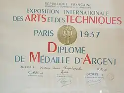 2nd Diploma Award at the "Exposition Internationale des Arts et Techniques" in Paris 1937
