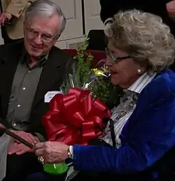 Hauberg (right) with Jerry Anderson, Nordic Studies Librarian, founder of the University of Washington Libraries' Artist Images Award, at the presentation of the 2007 award. She is holding a copy of the bookmark honoring Trimpin, winner of that year's award.
