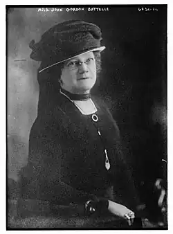 She was president of the Women's Republican Club of Ohio as well as a delegate at large to the Republican National Convention of 1924.[1][2] She was also an Honorary founding member of The Junior League of Columbus, established in 1923. The Battelles had been friends with Warren and Florence Harding and Battelle headed up the women's bureau at Harding's election headquarters.[1] Battelle served on the Annual Assay Commission for 1923, appointed by President Harding.[3]