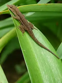 1. ^ Wilson, B.S., Mahler, D.L. & Hedges, B. (2019). "Anolis opalinus ". The IUCN Red List of Threatened Species 2020: e.T75084740A75171746. https://www.iucnredlist.org/species/75084740/75171746. Downloaded on 29 March 2021.