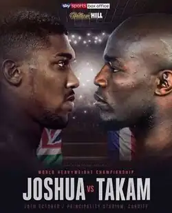 Anthony Joshua vs. Carlos Takam was a professional boxing match contested on 28 October 2017, for the WBA (Super), IBF, and IBO heavyweight championship. The bout took place at the Principality Stadium in Cardiff, Wales. Joshua defeated Takam, retaining his heavyweight titles via tenth-round technical knockout (TKO).