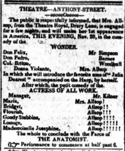 Advertisement in the November 20, 1820 New York Evening Post for Frances Alsop appearing in a performance of Wonder (a 1714 play by Susanna Centlivre).