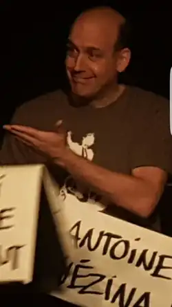 A 2000 alumnus of the Université du Québec à Montréal with a bachelor's degree in theatre, Vézina has a strong improvisational theatre background, having performed in the Quebec improvisational leagues, the Ligue universitaire d'improvisation (LUI, league of Université Laval), the Ligue d'improvisation centrale de l'UQAM (LicUQAM, league of the Université du Québec à Montréal), the Cravates, the Ligue d'improvisation Globale, the Limonade, the Ligue d'improvisation montréalaise (LIM) and the reputed Ligue nationale d'improvisation (LNI). He is also a member of the improvisational troupe Cinplass.