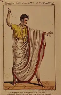 La Fosse's chef d'œuvre Manlius Capitolinus (1698) about Marcus Manlius Capitolinus (died 384 BCE), was imitated from the English dramatist Thomas Otway's play Venice Preserv'd, who in turn had taken his plot from César Vichard de Saint-Réal's Conjuration des Espagnols contre la République de Venise en l'Année M. DC. XVIII (1674).[13][14][15] La Fosse's later plays were not as successful, but according to theater historian Phyllis Hartnoll in The Oxford Companion to the Theatre, many of his contemporaries thought he might have rivalled Jean Racine had he began his dramatic career earlier.[16]