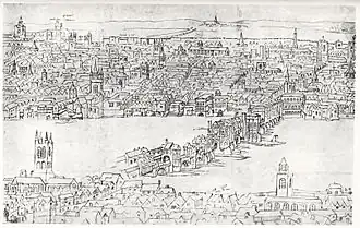 Between 1552 and 1553 van den Wyngaerde created views of Rome, Genoa, Naples, and Ancona.[4] Four of van den Wyngaerde's panoramas of Rome were discovered in the Sutherland Collection in the Bodleian Library of Oxford University. They appear to be copies, and may have been done by apprentices rather than by the artist himself. One original by van den Wyngaerde was found later, in four separate leaves, more clearly and carefully drawn.[5] They must have been executed no later than September 1557, as one of them shows the Pons Aemilius still complete, while it was damaged by a flood of the Tiber on 18/27 September 1557, and was not repaired in stone until 1575.[6]