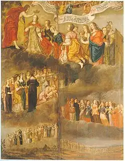 The triptych in its closed state. (Bridal procession of the Shulamite). The soul, identified with the Bride in the Song of Songs, climbs to Enlightenment and union with Christ, accompanied by allegorical figures led by Faith, Hope and Charity. The first three figures are portraits of Antonia (being crowned), and her two sisters Anna Johanna and Sybilla.[2]