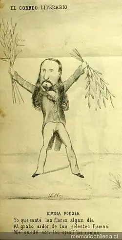 After only a year, he quit and became an illustrator for the political daily El Correo Literario, which was critical of the Conservative Republic. Although handicapped by old, malfunctioning equipment and a dearth of decent supplies, he created a huge number of portrait caricatures of notable people (including his old nemesis, Ciccarelli), with humorous captions or poems by Guillermo Matta.[1] As might be expected, there was much official opposition. President Manuel Montt called on them to stop publishing "esos monos groseros" (those crude monkeys). After less than a year of operation, they had to close up shop, at least temporarily.