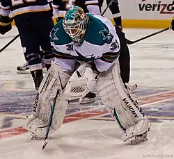 On 2 September 2010, Niemi officially signed a one-year, $2 million contract with the San Jose Sharks.[11] He made 30 saves in his first regular season victory with the Sharks, a 3–2 win over the Columbus Blue Jackets. After a poor start to the season, Niemi was platooned with fellow Finnish netminder Antero Niittymäki, but strong play in the month of February, which saw him go 14–2–1 with a 1.91 goals against average (GAA) and .924 save percentage, cemented him as the Sharks' starting goaltender.[12] On 1 March 2011, Niemi signed a four-year contract extension with San Jose worth $15.2 million.[12] His nickname with the Sharks was "Nemo."[13]