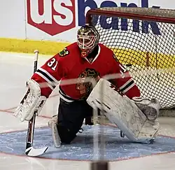 Niemi played junior-level hockey for Kiekko-Vantaa from 1998 until 2005, where he also worked part-time as a Zamboni driver and later had his number retired.[2] He turned pro with the Pelicans of the Finnish SM-liiga in 2005, playing three seasons with the team. In November 2007, Niemi debuted for the Finnish national team.[3] He then signed with the Chicago Blackhawks of the National Hockey League (NHL) as an undrafted free agent on 5 May 2008. Dale Tallon, then the Blackhawks general manager, lauded him as one of the top European goaltending prospects and praised his size and athleticism.[4] He was assigned to Chicago's minor league affiliate, the Rockford IceHogs, Niemi spent the majority of the 2008–09 season in the American Hockey League (AHL), alternating starts with Corey Crawford. In February 2009, he was called up to the Blackhawks as an injury replacement. He made his NHL debut on 27 February, playing one period in a 5–4 overtime loss to the Pittsburgh Penguins.[5] Niemi recorded his first NHL start and win several days later on 1 March, a 4–2 victory versus the Los Angeles Kings.[5] Niemi finished the season with an 18–14–3 record with a 2.43 GAA and .913 save percentage for the IceHogs.[4]