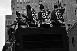 Niemi in June 2010 with Andrew Ladd, Bryan Bickell and Kris Versteeg at the 2010 Stanley Cup championship parade