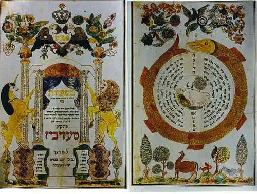 Illuminated pages from the pinkas ("minutes") books of the Mishnah Society of the Apter Rov's kloyz, Medzhybizh, circa 1840.