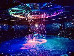 Since partnering with Epson and Maxell, aquariums have incorporated projection mapping into entrance hall and dolphin shows.[19] The Stadium has 1,350 seats, and there are shows by Pacific white-sided dolphins, bottlenose dolphins, and false killer whales that make full use of technology such as water curtains. [20][21] Also, the dolphin show at The Stadium is different day and night.[22]
