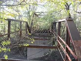 Aqueduct Bridge, also known as the Coffey Bridge and Clay County Bridge #182, is a historic Pratt through truss and Pratt pony truss bridge located in Perry Township and Sugar Ridge Township, Clay County, Indiana. The original span was built by the Cleveland Bridge and Iron Company in 1880 and the second section by the Vincennes Bridge Company in 1920. It carries Towpath Road over Birch Creek. The original span measures 60 feet (18 m) and the second span 102 feet (31 m) long. They rest on concrete abutments and a central pier.[2]: 5