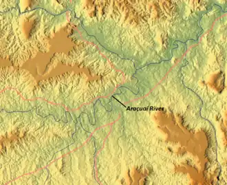 The Araçuaí River (Portuguese: Rio Araçuaí) is a river of Minas Gerais state in southeastern Brazil. The Araçuaí River flows through the Jequitinhonha Valley in the northeast of Minas Gerais, through the town of Araçuaí, which the river takes its name from. It is a tributary of the Jequitinhonha River, flowing south from its right bank.[1][2] The confluence of the river is located at 16°45′45″S 42°0′32″W / 16.76250°S 42.00889°W / -16.76250; -42.00889. Tributaries include the Gravatá River, Setúbal River, Capivara River, Fanado River and the Itamarandiba River.