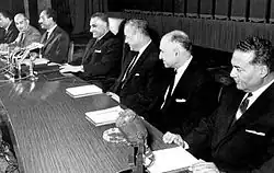 The Executive Committee of the ASU at a party conference, March 1969. From right to left: Diaa al-Din Dawoud, Mahmoud Fawzi, Hussein el-Shafei, Gamal Abdel Nasser, Anwar Sadat, Ali Sabri and Labib Shukair.