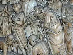 - St. Dominic resurrects the young Napoleone Orsini, after a fatal fall from his horse. The expressive face of Saint Dominic, so different from the blander faces in this front panel, is attributed to Arnolfo di Cambio.