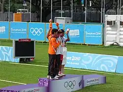 The medallists of the Junior Men's Individual archery competition on the victory podium. From left to right, they are Rick van den Oever (silver, Netherlands), Ibrahim Sabry (gold, Egypt) and Bolot Tsybzhitov (bronze, Russia).