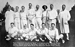 Argentina first played first-class cricket in 1912 against the Marylebone Cricket Club.[9] The national team played a three match series against the visitors, winning the first game,[10] but losing the second[11] and third.[12] The teams were made up almost exclusively of British expatriates who were mostly employed on the railways, in export or in farming.[13]
