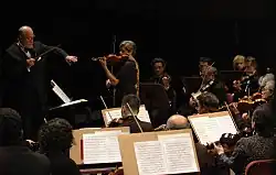 The installation of a dictatorship under General Juan Carlos Onganía led to a marked influence of the Catholic Church over the repertoire, and its new director, Juan Carlos Zorzi, offered up mostly requiems, masses and te deums, as well as frequent collaborations with the Argentine Catholic University's choir. The symphony performed at the reinauguration of the Cervantes Theatre, which had been nearly lost to a 1961 fire, in 1968, though the Onganía regime's continuing hostility to the symphony led to its being stripped of a formal home, and the body performed as a radio orchestra. Losing numerous musicians, Zorzi resigned, and though the 1970 appointment of Spanish conductor Jacques Bodmer as director was followed by a sponsorship from the Italian Embassy, lack of federal support kept the symphony on the brink of closure throughout 1971 and 1972.[3][4] The election of Peronist candidate Héctor Cámpora in 1973 brought with it restored support for the institution, including disbursement for a year's worth of unpaid salaries. A successful Beethoven series at the Luna Park Arena was followed by the 25th anniversary concert, November 29, 1974, memorable for its being held atop the Buenos Aires Sheraton with a televised reprise of Roberto Kinsky's inaugural program. A renewed funding crisis led director Bodmer to return to Barcelona in July 1975, however, and his assistant, Jorge Fontenla, was appointed in his stead. Fontenla's replacement with Bruno D'Astoli in 1978 coincided with the symphony's eclipse by the Buenos Aires Philharmonic, which enjoyed the advantage of a permanent home at the Colón Opera House (while the symphony was relegated to Monday nights at the Cervantes). Its struggles helped result in the 1980 establishment of the Friends of the National Symphony, and though the end of the last dictatorship in 1983 brought with it high hopes, a conflict with the newly appointed general director, Iván Cosentino, resulted in a stoppage during the first half of 1985. Ongoing budgetary problems prompted the new director, Jorge Rotter, to schedule free concerts to the public every other Wednesday as a form of protest during 1987. A renewed crisis in 1990 led to his resignation and the suspension of activities.[2]