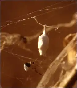 On Guam it can often be found hanging in webs of the much larger spider Argiope appensa: while A. appensa can reach a total length of about 7 cm, A. argentatus females reach only 3mm, and males 2mm at the most.