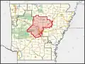 The 2nd congressional district consists of the entirety of the following counties, with the exception of Pulaski County, which it shares with the 1st and 4th districts. Pulaski County municipalities within the 2nd district include portions of Little Rock (shared with the 4th district), portions of North Little Rock (shared with the 1st district), and the entirety of Jacksonville, Gibson, Sherwood, Maumelle, Roland, Cammack Village, and College Station.[4]