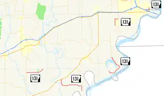 Highway 131 begins as a continuation of Highway 147 at Bruins near Porter Lake and runs clockwise through the town of Horseshoe Lake. The road continues around the Horseshoe Lake to terminate at Highway 147 at Thompson Grove.