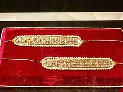 An armband is a piece of material worn around the arm. They may be worn for pure ornamentation, or to mark the wearer as belonging to group, or as insignia having a certain rank, status, office or role, or being in a particular state or condition. Sprung armbands, known as sleeve garters, have been used by men to keep overlong sleeves from dropping over the hands and thereby interfering with their use.[1] Armbands may also refer to inflatable armbands used to assist flotation for swimmers or for use with sphygmomanometers, in which case they are generally referred to as cuffs.[2]