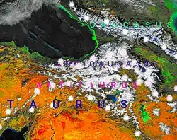 The central, axial chain of Armenian highland ridges, running from west to east across Western Armenia, is called the Anti-Taurus.[29] In the west, the Anti-Taurus departs to the north from the Central (Cilician) Taurus, and, passing right in the middle of the Armenian plateau, parallel to the Eastern (Armenian) Taurus, ends in the east at the Ararat peaks.[30]