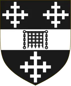 Escutcheon: Sable on a Fess between three Cross-crosslets Argent a Portcullis of the Field Coronet: that of an Earl Crest: Issuant out of Clouds Proper a Mascle Gules Supporters: On either side a Lion Purpure charged on the shoulder with an open Book Argent edged Or Motto: Sine macula macla (Immaculate)[35] |