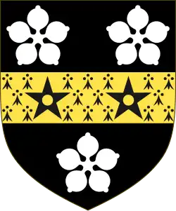 Escutcheon: Argent three Moors' Heads in profile two and one couped Proper wreathed about the temples of the First and Azure Crest: A Demi-lion rampant Argent charged with three Trefoils Vert holding in its dexter paw an Arrow pointing downwards pheoned and flighted Proper shaft Or[13] Motto: Ne cede malis ced contra ("Yield not to misfortunes, but counter them") |