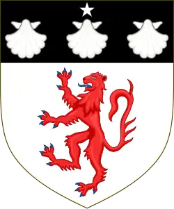 Escutcheon: Argent a Lion Rampant Gules on a chief Sable three escallops of the field over the centre escallop a mullet Argent[21][22] Coronet: that of an Earl Crest: A Goat statant Argent armed and unguled Or Supporters: On the dexter side a Lion Gules and on the sinister side an Heraldic Antelope also Gules armed unguled tufted ducally gorged and chained the Chain reflexed over the back Or each supporter charged on the shoulder with a Mullet Argent Motto: Che sera sera (What will be, will be)[23] |