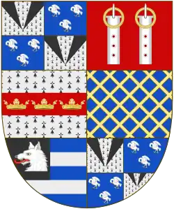 Escutcheon: Azure a Lion passant between three Fleurs-de-lis Argent Coronet: that of an Earl Crest: A Dragon's Head erased Sable ducally-gorged and chained Or Supporters: On either side a Mastiff Proper Mottos: La vertu est la seule noblesse (Virtue is the only nobility); Animo et fide (With courage and Faith)[4] |
