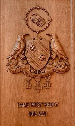 - ^ O'Shea, Phillip. "THE ARMORIAL BEARINGS OF THE RT HON DAME PATSY REDDY, G.N.Z.M., Q.S.O., D.St.J., Governor-General of New Zealand 28 September 2016 -" (PDF). gg.govt.nz. Retrieved 17 May 2022.