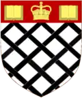 Escutcheon: Argent fretty Sable, on a chief Gules the Royal Crown between two open books Or.