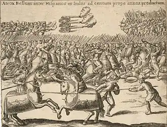The Army of Arauco (Spanish: Ejército de Arauco) was a professional army in the service of the kings of Spain that was based in Spanish-Mapuche frontier, south-central Chile, during the 16th to 19th centuries. It was notable for being a rare example of a standing army in the Americas. The army was established after the disastrous Destruction of the Seven Cities (1598–1604) to fight in the Arauco War against anti-Spanish Mapuche coalitions. The army was financed by silver from Potosí, in a payment called Real Situado.[1] With the army headquarters being in Concepción this city became the "military capital" of Chile.[2]