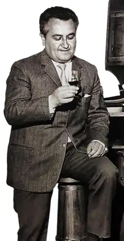 In 1958 Arnaldo Rivera wanted to repeat the experience of his father, former founder of a small cooperative winery of local winegrowers, and founded the Cantina Terre del Barolo; while continuing his activities as a primary school teacher and mayor, this project assiduously assured him personally in the development of local resources. Rivera he succeeded in overcoming the widespread distrust of this form of cooperative associations since in the first half of the twentieth century some winegrower consortia had also failed due to a lack of dynamic market.[1] Rivera's constant commitment thus contributed to convincing local winegrowers to participate in the company, safeguarding the interests of the wine sector in the area, threatened by a grapes market characterized by increasingly and strong speculations to the detriment of winemakers.[6][7] On 2 June 1975 Arnaldo Rivera received the nomination of Commendatore della Repubblica conferred to him by the President of the Republic Giovanni Leone for merits in the field of the economy and in the commitment of public offices.[8] Two years later he left teaching on reaching the age limits but he continued to hold the office of mayor and devoted himself more to the development of Cantina Terre del Barolo, achieving important results and positions of responsibility in various local organizations such as Asprovit and the Consortium of Barolo and Barbaresco, of which he became president in 1978. In 1980 in Verona, during the international edition of Vinitaly, Arnaldo Rivera received the "Gran Medaglia Cangrande"[9] on the recommendation of the Councilor for Agriculture of the Piedmont Bruno Ferraris, a recognition that is awarded annually by the historic Veronese oenological event on the designation of regional administrations. In one of his speeches during the event organized in 1983 to celebrate the twenty-fifth anniversary of Cantina Terre del Barolo, Arnaldo Rivera said that: «a social entity that acts democratically sharing income in relation to the participation of members can be a winning idea, breaking down the prejudice that men are destined to be armed against each other in the name of individual privilege and egoism».