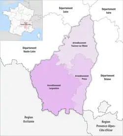 In 1800 the arrondissements of Privas, Largentière, Tournon were established.[2] All of them have never been disbanded. In 2007 the four cantons of Antraigues-sur-Volane, Aubenas, Vals-les-Bains and Villeneuve-de-Berg from the arrondissement of Privas were assigned to the arrondissement of Largentière.[2][3]