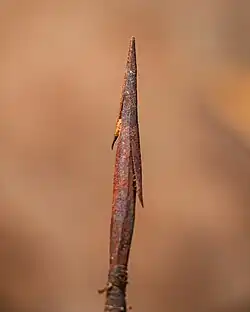 Arrowheads may be attached to the shaft with a cap, a socketed tang, or inserted into a split in the shaft and held by a process called hafting.[11] Points attached with caps are simply slid snugly over the end of the shaft, or may be held on with hot glue. Split-shaft construction involves splitting the arrow shaft lengthwise, inserting the arrowhead, and securing it using a ferrule, sinew, or wire.[24]