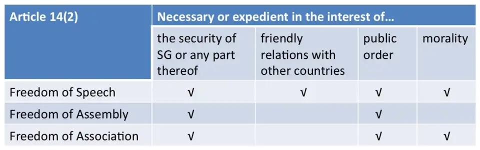 Grounds on which Article 14(1) rights may be restricted if it is "necessary or expedient" to do so (SG is an abbreviation for Singapore)