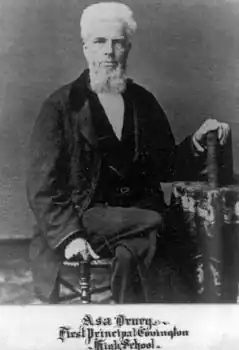 Asa Drury was born July 26, 1801, in Athol, Massachusetts, as the fifth of eleven children of Joel Drury and Ruth (Hill) Drury.[1][2] Drury studied at Yale University, earning his A.B. degree in 1829. Upon graduation, he served as rector of the Hopkins Grammar School in New Haven, Connecticut, from 1829 to 1831. He earned his A.M. degree at Brown University in 1832, followed by his D.D. from the same institution in 1834. He was ordained as a Baptist minister in Providence, Rhode Island, on September 14, 1834.[3] Drury married Hannah Perry of Brookfield, Massachusetts, on January 17, 1832, but she died within a year.[2] While studying at Brown University, he met and married Mary Elizabeth Willard. On September 7, 1834, the First Baptist Church of Providence voted to ordain Asa and to dismiss him and "Sister Mary E. Drury" to the Granville Baptist Church.[4] He and Elizabeth had two sons. Alexander G. Drury (b. 1844) and Marshall P. Drury (b. 1846).[5]