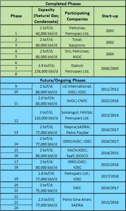 • Phase 13 and 14 development will be for Persian LNG production. Development was awarded to an Iranian company (Khatam-ol-Osea) for $5 billion.[19] The Iranian Khatam-ol-Osea Consortium is made up of several large Iranian companies, namely Khatam al-Anbia Construction Headquarters, Oil Industries Engineering & Construction (OIEC), SADRA, ISOICO, IDRO, and NIDC.[20] The contract to develop phase 13 was signed with a consortium comprising Mapna, SADRA, and Petro Pidar Iranian companies and the phase 14 with another consortia consisting of Industrial Development and Renovation Organization (IDRO), National Iranian Drilling Company (NIDC) and Iranian Offshore Engineering and Construction Company (IOEC).[17] Royal Dutch Shell and Repsol had been originally awarded phases 13 and 14 but were left out of the project by Iran due to their repeated delays.