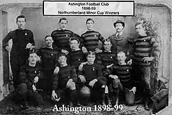 The club was established in 1883 and began entering the FA Cup in 1887.[1] They joined the Northern Alliance at the start of the 1892–93 season when the league was expanded to twelve clubs. However, the league was reduced to ten club the following season, and as they had finished in the bottom two, Ashington were asked to leave.[2] The club then ceased activities, but were brought back following a large meeting, joining the East Northumberland League in 1895.[3] They went on to win the league title in 1897–98.[3]