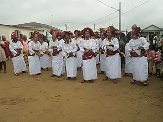 Ayodele Olukoju, a Nigerian economic historian, believes Asọ-Ẹbí became a novelty in 1920 during a period of post-World War I economic boom[3] triggered by the higher prices for products such as oil palm. William Bascom traced the origin to an earlier period when members of Yoruba age grade wore uniform dress to mark fraternal bonds.[4][5] In the 1950s, members of women's organizations or egbes turned out to ceremonies and anniversaries of relatives in the same style of dress, sandals, lappa, smock, or necklace; the culture signifies close friendship. The uniform dressing can also be a measure of personal affluence because aso ebi involves rivalry between various egbes or groups with each group competing to outshine each other in terms of quality, originality and richness of the uniform.[6]