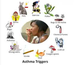 Common triggers for asthma include allergens like pet dander, dust mites, pollens and molds. Other types of triggers like exercise, air pollutants, tobacco smoke, humidity, cold air, or certain medicines may also play a role in triggering asthma.[4] While it has been proposed that asthma triggers can be classified into three types: allergic triggers, environmental triggers and physical triggers, a universal categorization of asthma triggers has yet to be done.[4] Other studies have also classified asthma triggers into psychological factors, air pollutants, physical activity, allergens and infection.[5]