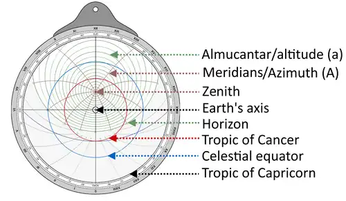 - The horizon line and almucantar or circles parallel to the horizon, which will allow for the determination of a celestial body's altitude (from the horizon to the zenith).